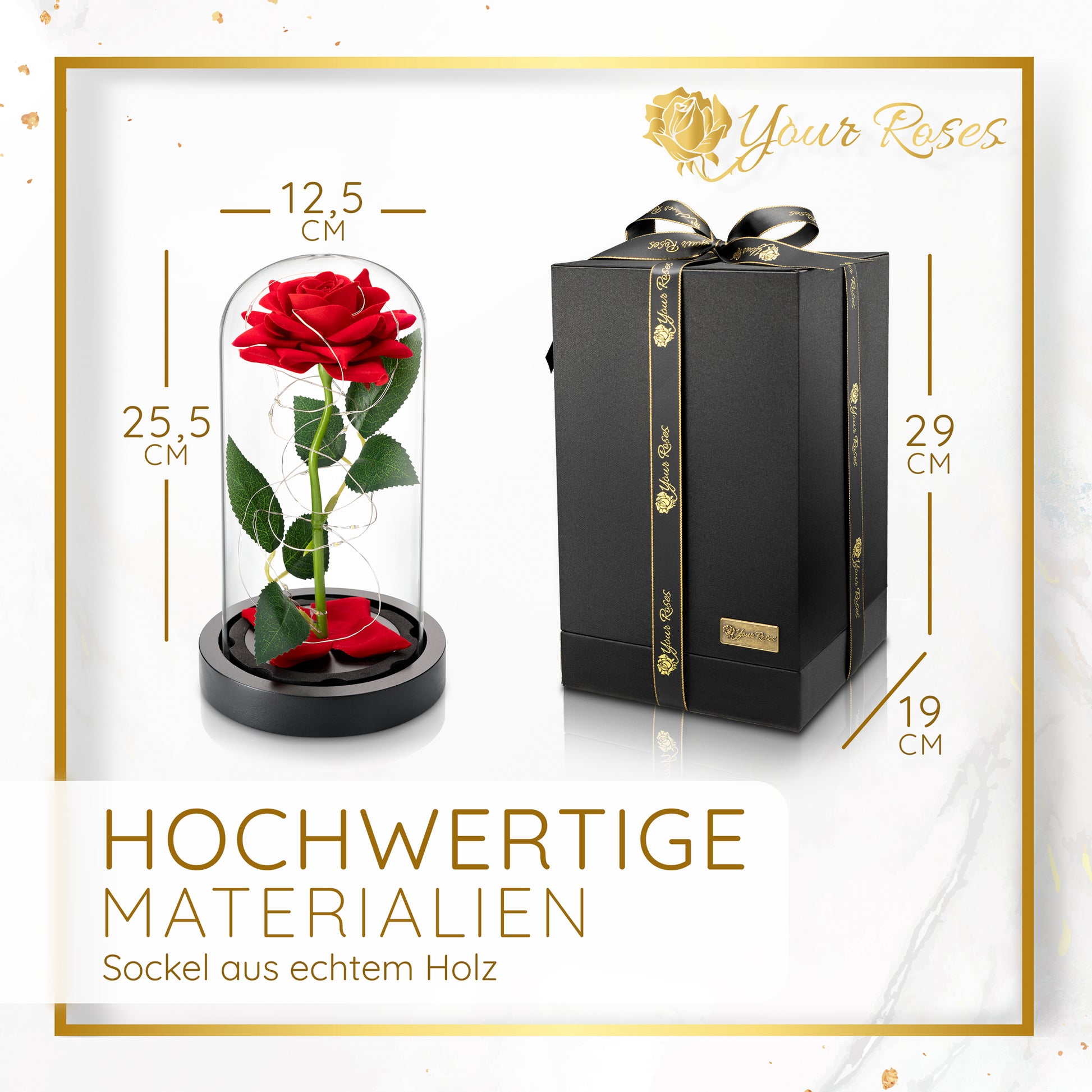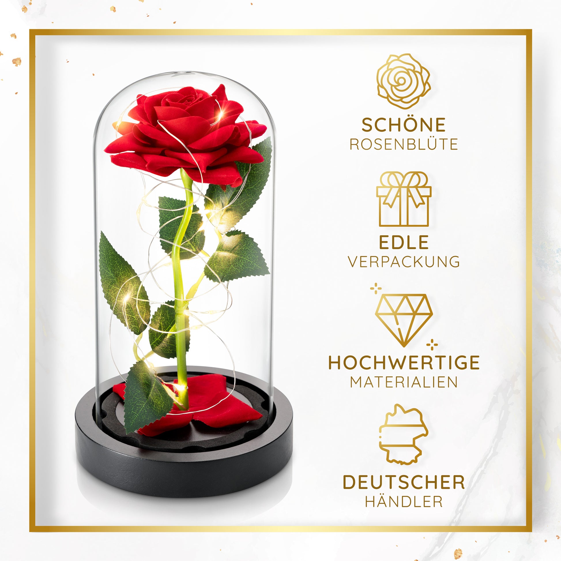 - 1x kunststof roos in glazen koepel met LED-lichtketting