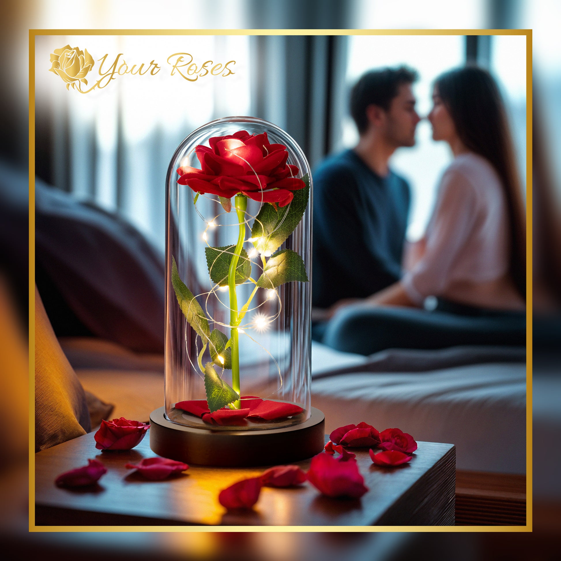 Deze geschenkdoos bevat een roos in een stijlvolle glazen koepel, omlijst door een lichtsnoer met ledlampjes dat een magische sfeer creëert. Perfect voor gelegenheden zoals jubilea, huwelijksverjaardagen, verjaardagen of Valentijnsdag – of als een bijzonder cadeau voor elke dag.